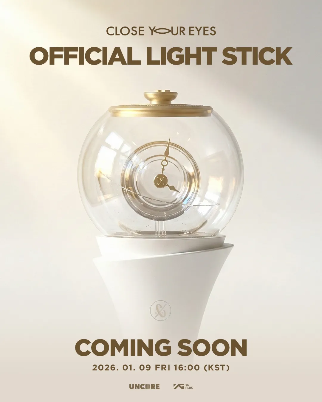 On January 5, CLOSE YOUR EYES released a new poster unveiling the design for their official light stick, which features golden accents and a clock that signals their debut date April 2 with the time.