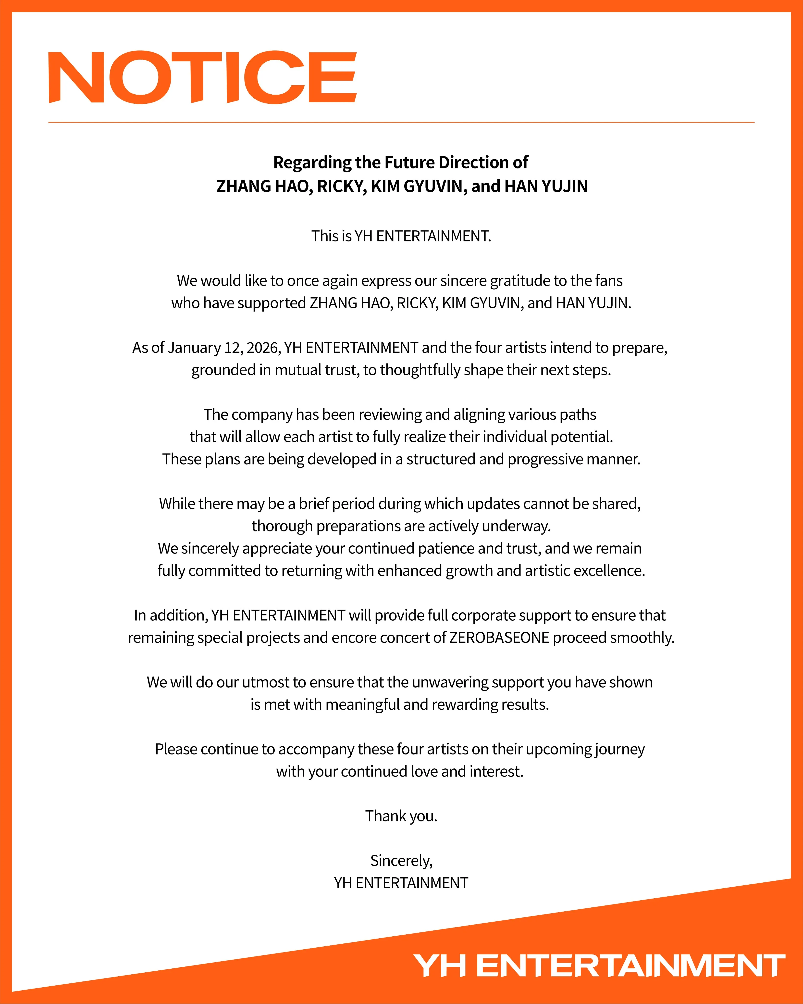 On January 12, YH Entertainment shared an official statement addressing the future direction of the four members following the conclusion of their activities with ZEROBASEONE.